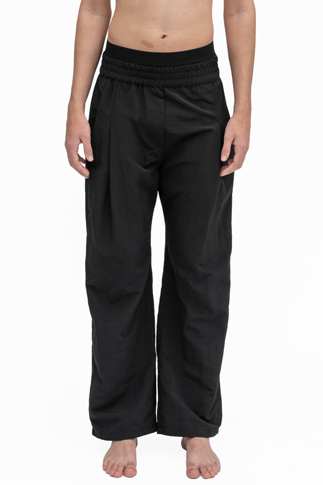 Ungendered Utility Pant in black is made from water repellent nylon. Modern front pleat and signature front and back pockets for your everyday carry. Tonal stitching.