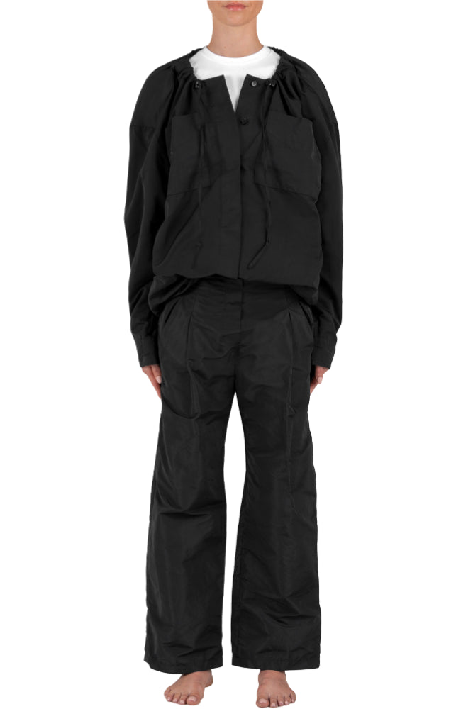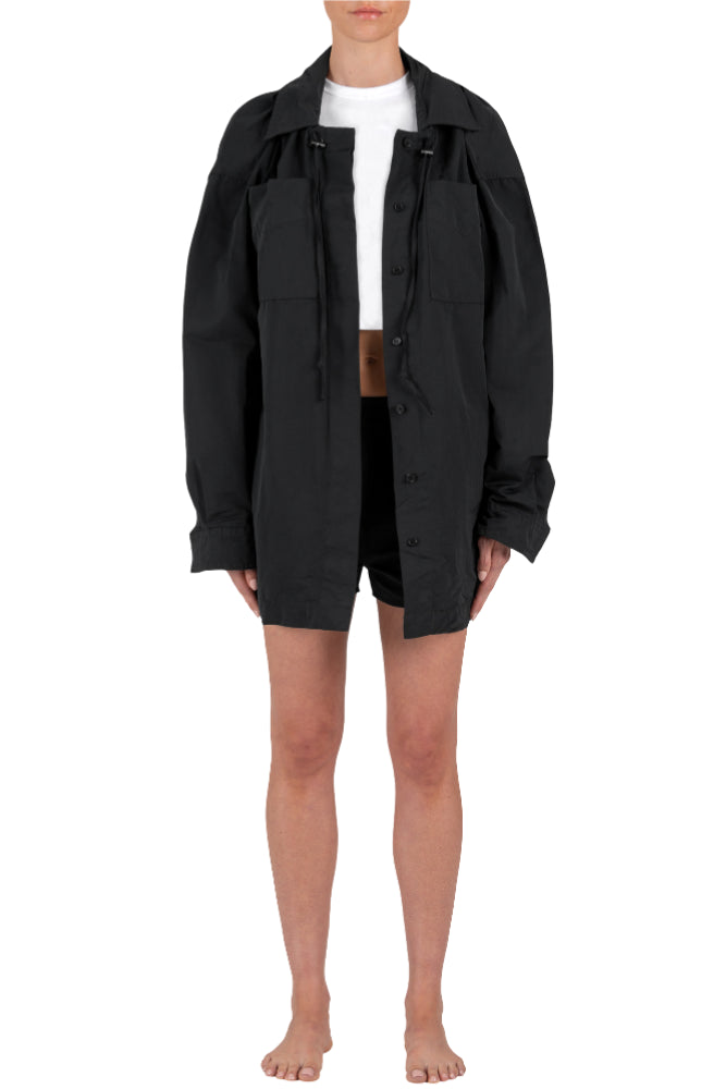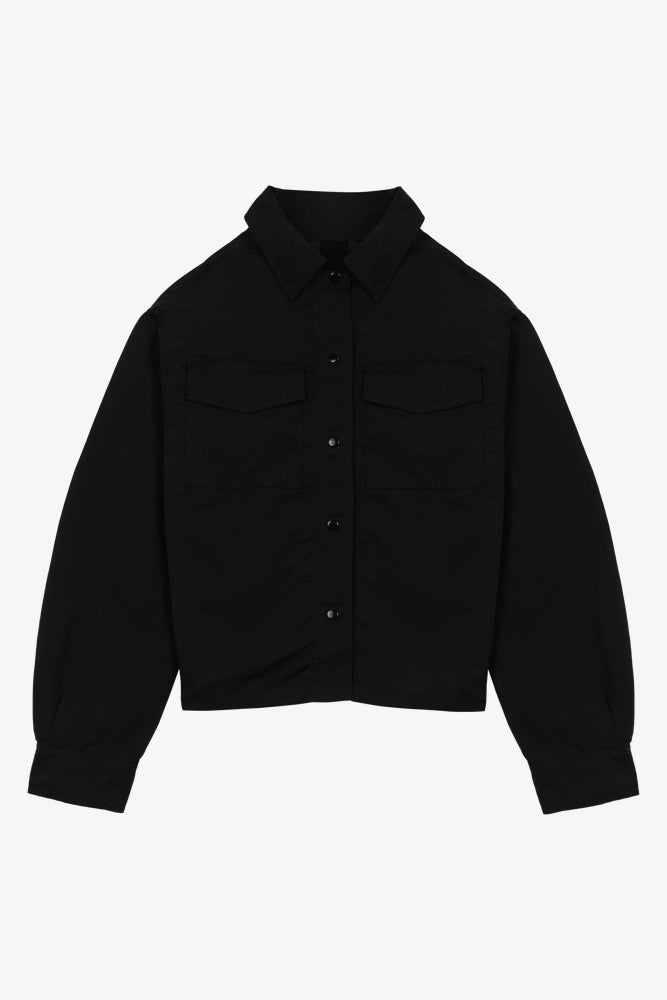 Ungendered Utility Shirt in black is made from water repellent nylon. Modern front pleat and signature front and back pockets for your everyday carry. Tonal stitching.